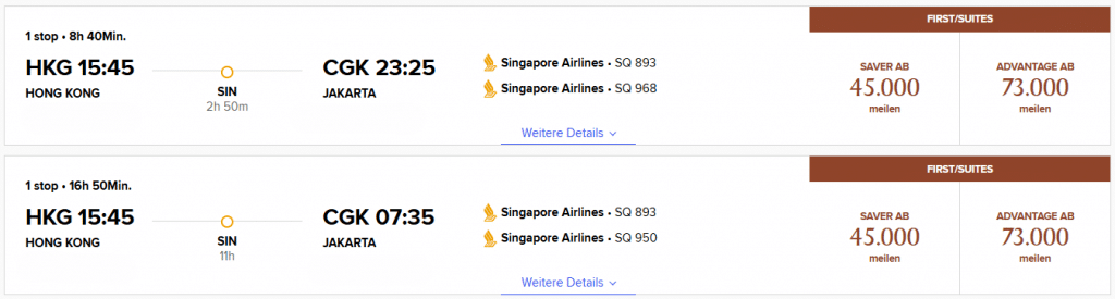 Ebenfalls eine sehr attraktive Einlösung sind 45.000 KrisFlyer Meilen (entspricht 67.500 Membership Rewards Punkten) von Hongkong über Singapur nach Jakarta in der Singapore Airlines First Class. Dabei könnt Ihr neben der Suites Class von Hongkong nach Singapur (nicht auf allen Flügen) auch die normale First Class von Singapur nach Jakarta testen.
