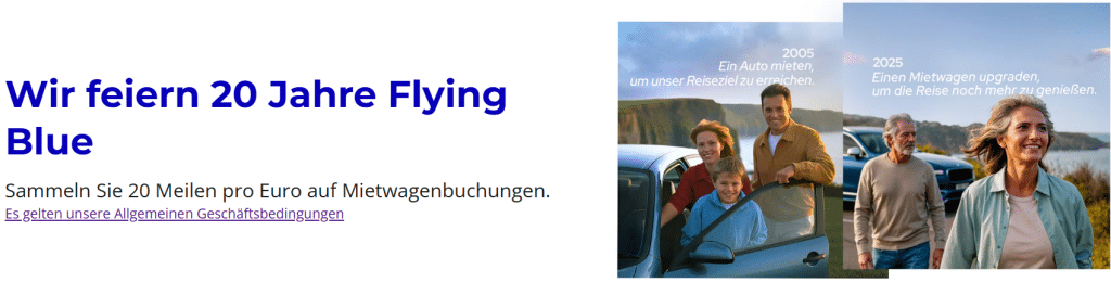 Flying Blue bietet regelmäßig Meilen mit Bonus oder Rabatt an und ist daher auch für Meilenkäufe interessant. Bei der aktuellen Aktion bietet Flying Blue jedoch keine Meilen zum Kauf an, sondern verschenkt sie. Wenn Ihr bis zum heutigen 12. Dezember 2025 Mietwagen bei Hertz bucht und die Anmietung bis zum 31. März 2026 stattfindet, dann erhaltet Ihr für jeden Euro 20 Bonusmeilen. Um das 20. Jubiläum zu feiern, soll es in der nächsten Zeit zudem noch mehr Aktionen und Events geben.