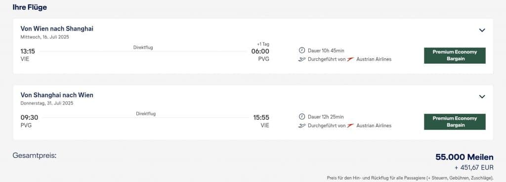 Was die Verfügbarkeiten anbetrifft, haben wir uns das Meilenschnäppchen in der Business Class nach Shanghai angeschaut. Hier scheint es zum Zeitpunkt der Veröffentlichung allerdings noch keine Verfügbarkeit zu geben.