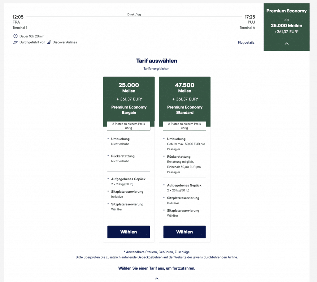 Ferner solltet Ihr im Blick haben, dass die Meilenschnäppchen nicht mit der FlySmart Prämie kombiniert werden können. Es ist also nicht möglich, gegen einen höheren Meilenpreis die nicht zu vernachlässigenden Zuschläge einzusparen. Weiterhin ist bei den Discover Meilenschnäppchen keine Kombination mit der Senator Warteliste oder dem Companion Award möglich.