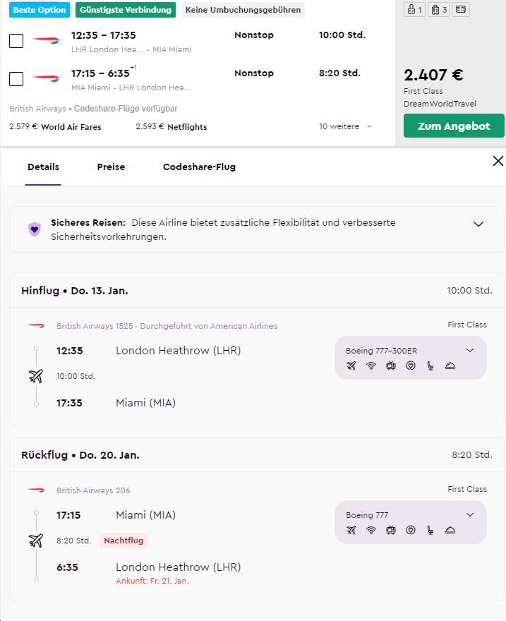 Der Zubringerflug nach London erfolgt in der Business Class. Ab dort wird der Weiterflug nach New York auch teilweise von American Airlines mit einer Boeing 777 durchgeführt. Regulär kosten diese Flüge mindestens über 4.000 Euro!