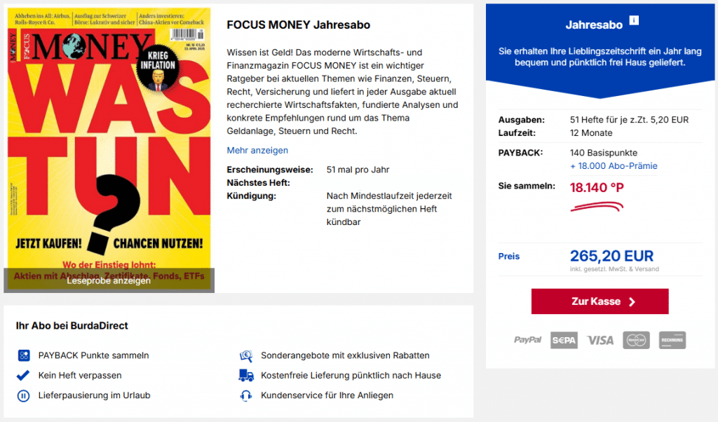 Bei der aktuellen Abo-Aktion von BurdaDirect erhaltet Ihr für das Focus Money-Jahresabo (12 Monate) zum Preis von 280,50 Euro insgesamt 21.150 Payback Punkte. Die Summe setzt sich aus 150 Basispunkten sowie ausgewiesenen Bonuspunkten, darunter Aktionsprämien und Abo-Prämien, zusammen. Das Angebot bezieht sich auf das Jahresabo mit 51 Ausgaben.
