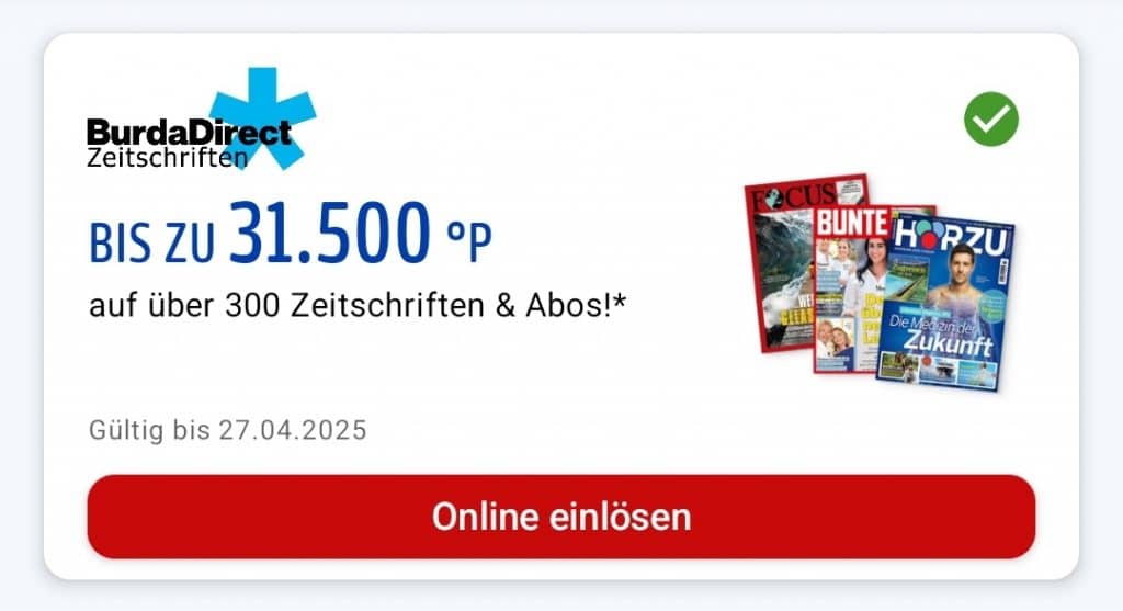 Vor Abschluss des Abonnements solltet Ihr sicherstellen, dass Ihr den Payback Partnerlink von BurdaDirect nutzt und Eure Kundennummer im Bestellprozess eingebt. Nur so wird die Punktegutschrift korrekt erfasst. Die Punkte erscheinen zunächst in gesperrter Form auf Eurem PAYBACK Konto und werden nach etwa zwölf Wochen gutgeschrieben, sofern kein Widerruf erfolgt.