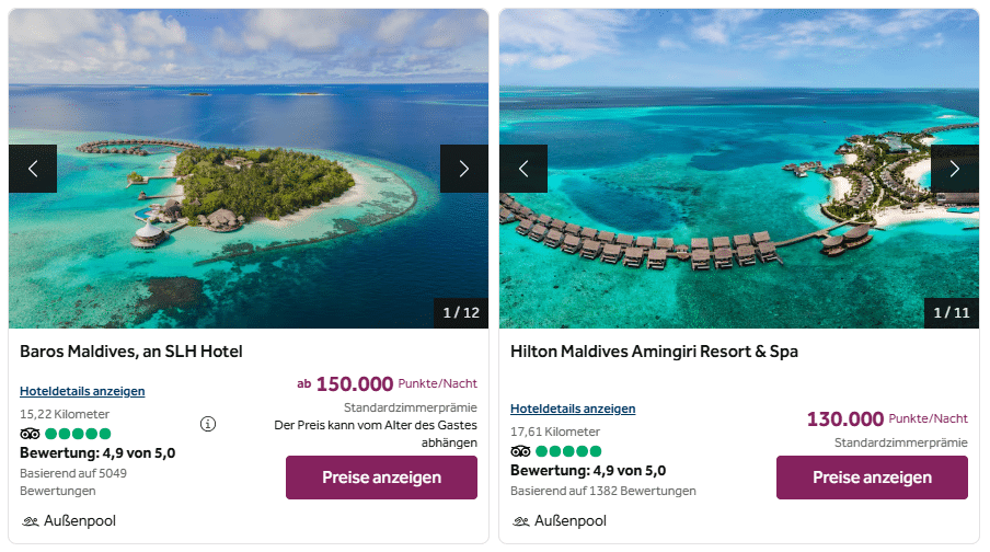 Zwar muss man in der Hochsaison erst einmal passende Verfügbarkeiten finden, allerdings ist die Buchung mit Punkten dann gerade bei Destinationen wie den Malediven oder auch in der Karibik fast immer attraktiver als eine bezahlte Buchung. Dasselbe gilt teilweise auch in Großstädten wie London, Paris oder New York.