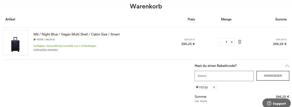 Dadurch bekommt Ihr etwa den M5 Handgepäckkoffer mit zusätzlicher Front-Tasche, in verschiedenen Farben, bereits für 245 anstatt 365 Euro. Dabei stehen zusätzlich Rucksäcke, Trolleys, Koffer und kleine Taschen in vielen Farbtönen zur Auswahl. Da der Sale wie erwähnt nur für kurze Zeit geht, solltet Ihr Euch nicht zu viel Zeit lassen. Der günstigste Koffer im Sale ist dabei der Essential-Trolley H5, den Ihr so ab nur 190 Euro bekommt.