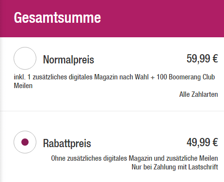 In der Regel habt Ihr bei Eurer Buchung bei Eurowings die Wahl zwischen “Rabattpreis” und “Normalpreis”. So wirklich passend sind die Beschreibungen allerdings nicht, der Rabattpreis ist nämlich einfach der normale Preis aus der Flugsuche ohne Aufpreis, der Normalpreis dagegen 10 Euro teuer. Bei ersterem könnt Ihr nur per Lastschrift zahlen, bei kurzfristigen Buchungen auch mit PayPal. Wer mit Kreditkarte zahlen möchte, muss allerdings auf den Normalpreis zurückgreifen und damit 10 Euro Aufpreis zahlen.