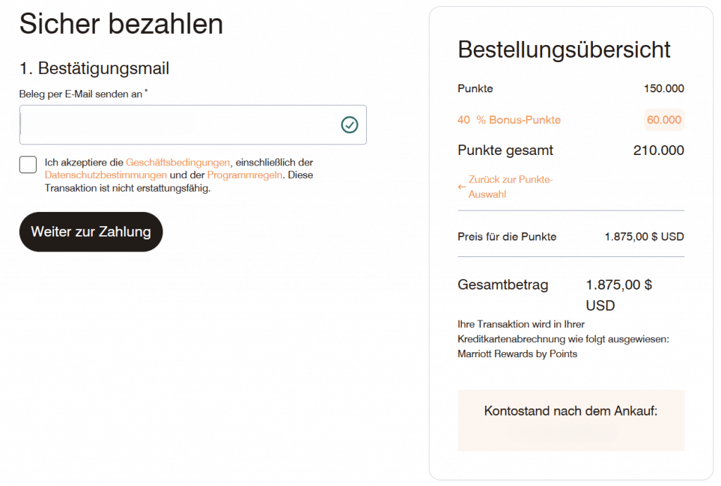 ℹ️ Beachtet, dass es sich um eine sogenannte Mystery-Aktion handelt, sodass es vorkommen kann, dass der Bonus in Eurem Account geringer ist. Im Blick haben solltet Ihr, dass der Kauf von Marriott Punkten mit Bonus teilweise erst ab einer bestimmten Schwelle möglich ist. Teilweise gibt es auch einen gestaffelten Bonus, sodass es bei einem Kauf kleinerer Mengen einen etwas geringeren Bonus gibt.