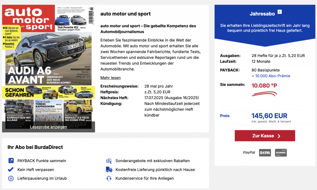 Der aktuelle Deal von Burda Direct – welcher durchaus personalisiert sein kann – lohnt sich, da Ihr bei dem auto motor und sport Print Jahresabo für einen Preis von 145,60 Euro insgesamt 11.000 Bonus Payback Punkte zusätzlich zu den 80 Basispunkten erhaltet. Daraus ergibt sich ein effektiver Preis von 1,31 Cent pro Punkt. Das Sonderangebot gilt dabei für ein Abonnement mit einer Laufzeit von zwölf Monaten.