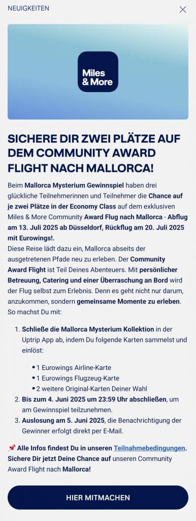 Passend zum dritten bevorstehenden Miles & More Community Award Flight, können Nutzende der App Uptrip unter dem Motto “Mallorca Mysterium” bis zum 4. Juni 2025 einmal zwei Tickets in der Economy Class gewinnen. Insgesamt drei Teilnehmer erhalten die Chance auf den Gewinn. Um die folgenden Flüge handelt es sich hierbei: