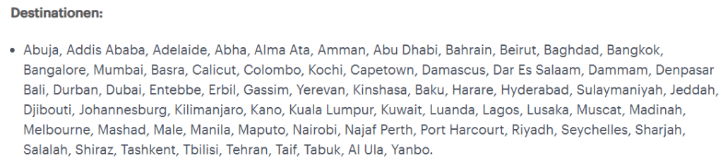 Wie bereits dieses Beispiel zeigt, ist die Angabe bis zu 10 Prozent etwas vage formuliert, denn man erhält bei diesem Flug gerade einmal 3,29 Prozent Rabatt. Der Flash Sale ist für einige Ziele gültig, wie die Aufzählung aus den Bedingungen zeigen:
