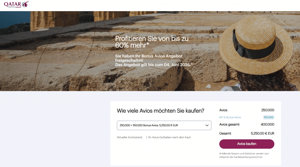 Nur noch wenige Tage wartet ein attraktives Angebot auf Euch, bei dem Ihr Qatar Airways Privilege Club Avios mit einem hohen Bonus von bis zu 65 Prozent kaufen könnt. Der Deal läuft nur bis zum 6. Dezember 2025.