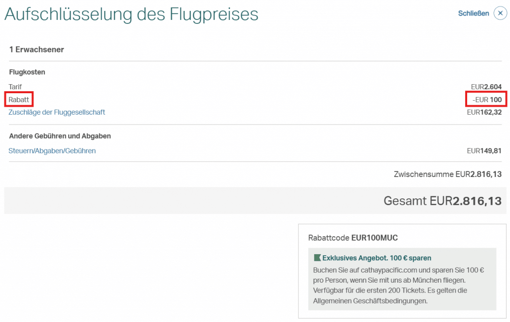 Wichtig ist, dass das Angebot nur für Cathay Pacific Flüge gilt, die ab München starten. Zudem müsst Ihr die Buchung über die offizielle Website von Cathay Pacific durchführen, nur dort ist der Rabattcode einsetzbar und gilt nur für Hin-und Rückflüge.