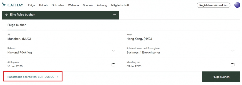 Mit dem aktuellen Rabattcode könnt Ihr Euch bei einer Flugbuchung mit Cathay Pacific eine Gutschrift von 100 Euro sichern. Das Angebot läuft bis zum 13. Mai 2025 und steht ausschließlich für Abflüge ab München zur Verfügung. Doch Ihr müsst schnell sein, laut Cathay Pacific gilt dieser Rabattcode nur für die ersten 200 Einlösungen! Wenn Ihr über den Landingpage-Link geht, ist der Rabattcode bereits hinterlegt. Ihr könnt den Rabattcode aber auch in der normalen Buchungsmaske unten links einfach eingeben.