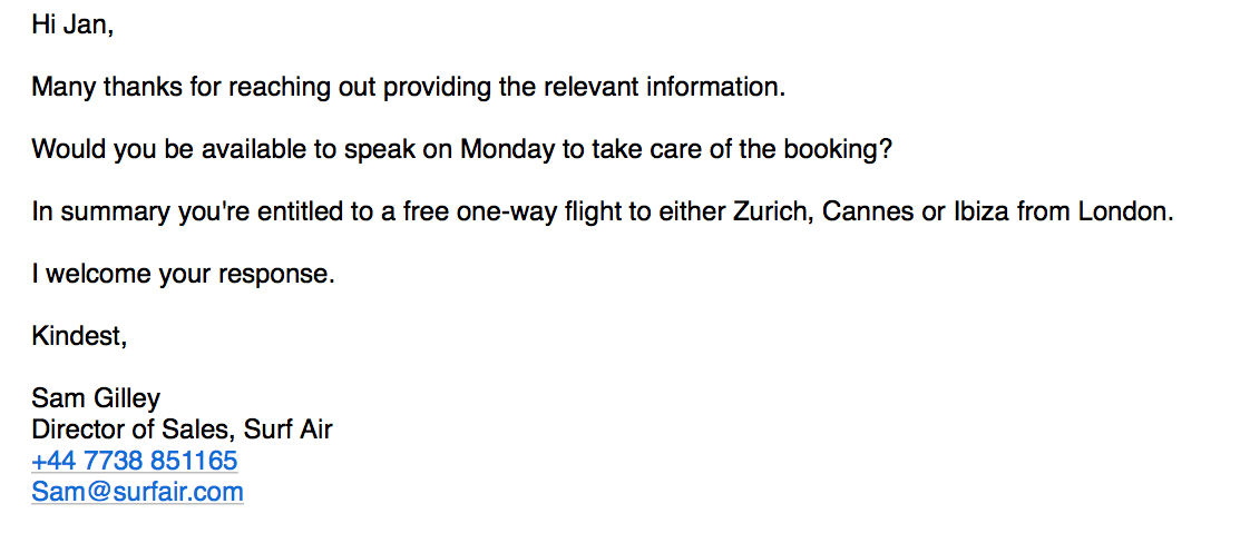 Um das Surf Air Angebot wahrnehmen zu müssen, braucht Ihr lediglich eine Mail mit dem Betreff “Gold” an [email protected] zu schicken und dort einen Nachweis für Euren Status zu erbringen. Wird Euer Antrag genehmigt, könnt Ihr einen kostenfreien One-Way Flug mit Surfair buchen. Dabei ist das Angebot lediglich auf Teilnehmer begrenzt, die einen Wohnsitz in Europa haben. Neben dem kostenfreien Flug ist auch die Buchung von einem weiteren Ticket mit 50% Rabatt möglich. Bisher gibt es keine Erfahrungen, aber wir alle haben bereits eine Mail verschickt und halten Euch natürlich auf dem Laufenden!