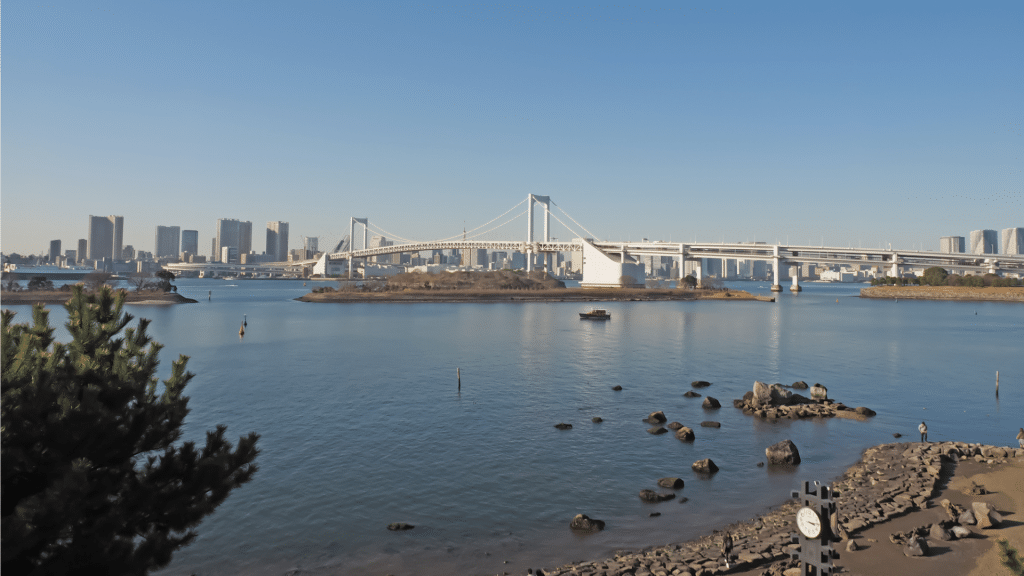 Auf der einen Seite die Skyline von Tokio und die aufgeschüttete Insel Odaiba mit der imposanten Rainbow Bridge. Die Brücke ist ebenfalls ein Wahrzeichen Tokios und knapp 800 Meter lang. Als Hängebrücke verbindet die beiden Stadtteile Shibaura und Odaiba. Besonders schön anzusehen ist sie bei Nacht. Von hier aus könnt Ihr den Tokyo Tower sehen und bei klarer Sicht bis zum Mount Fuji schauen. Für die Bewohner Tokios ist die Brücke aber auch ein wesentlicher Verkehrsknotenpunkt mit Fußgängerwegen und Bahnlinien und Autoverkehr.