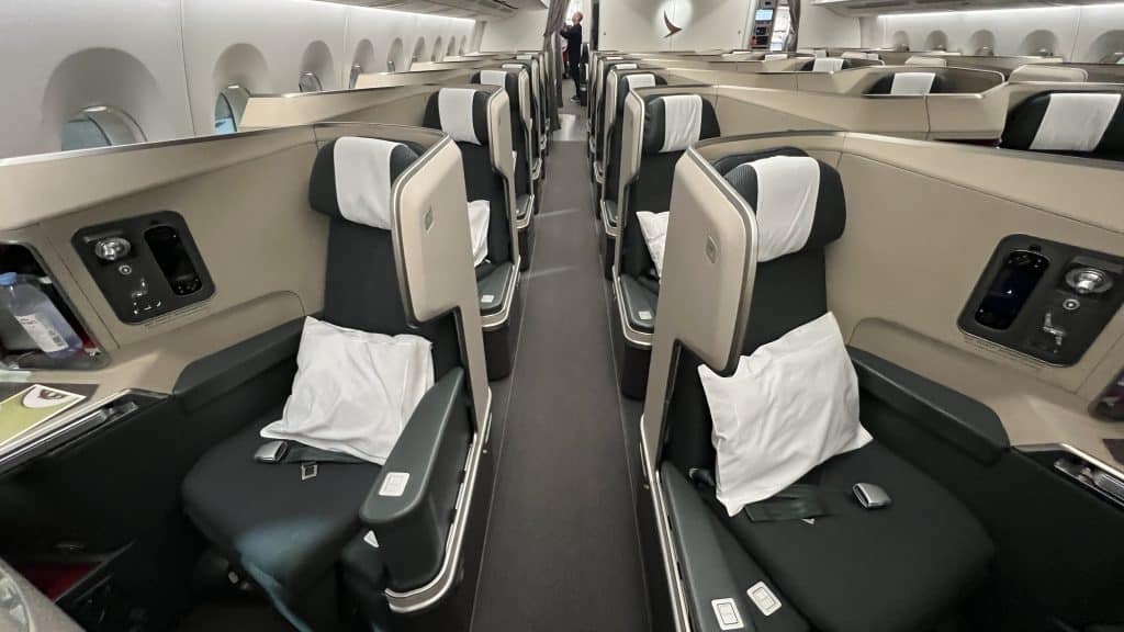 Zum Einsatz kommt ein Airbus A350-900 in einer Drei-Klassen-Konfiguration mit Economy Class, Premium Economy und Business Class. Die neue Aria Suite ist hier nicht verbaut, doch das Flugzeug verfügt über eine Business Class mit insgesamt 38 Sitzen, die sich allesamt zu einem gänzlich flachen Bett umwandeln lassen. Die Sitze sind dabei in einer 1-2-1 Konfiguration mit Zugang zum Gang angeordnet, verfügen allerdings über keine Türen.