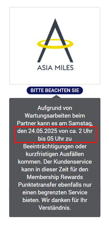 Am 24. Mai 2025 steht das Programm Asia Miles aufgrund von Wartungsarbeiten für rund drei Stunden nur sehr eingeschränkt zur Verfügung. Während dieses kurzen Zeitfensters ist ein Transfer von Membership Rewards Punkten zum Vielfliegerprogramm von Cathay Pacific nur bedingt möglich, so der Hinweis. Auch der Kundenservice kann im genannten Zeitraum nur begrenzte Unterstützung anbieten.