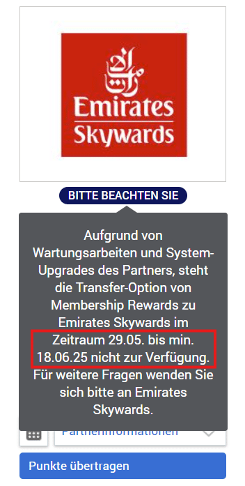 Etwas umfangreicher sind die Einschränkungen bei Emirates Skywards: Hier ist das Programm im Zeitraum vom 29. Mai bis einschließlich 18. Juni 2025 komplett für Punkteübertragungen gesperrt. Angegeben werden ebenfalls Wartungsarbeiten und zusätzliche System-Upgrades seitens Emirates Skywards. Wir empfehlen Euch daher, etwaige Transfers frühzeitig zu planen, gegebenenfalls vorab zu erledigen oder auf die Zeit nach dem Wartungsfenster zu verschieben. Vor allem mit dem Hintergrund, dass die Transfers nicht in Echtzeit durchgeführt werden und teilweise bis zu sieben Werktage dauern können.