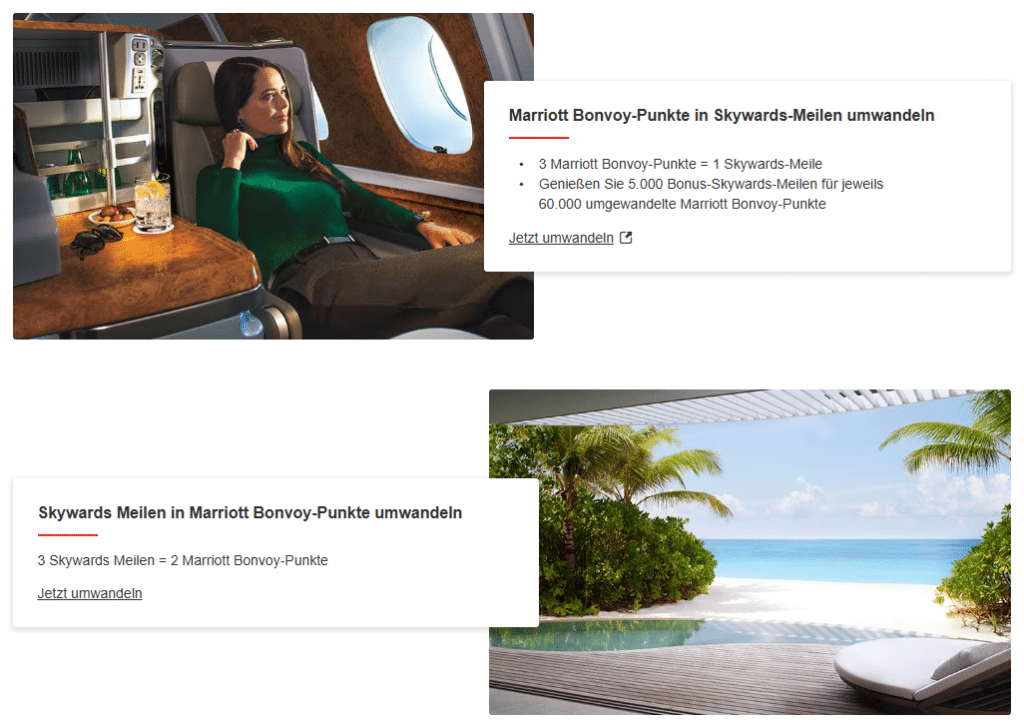 - 3 Skywards-Meilen in 2 Marriott Bonvoy-Punkte umwandeln (mindestens 3.000 Skywards‑Meilen)
