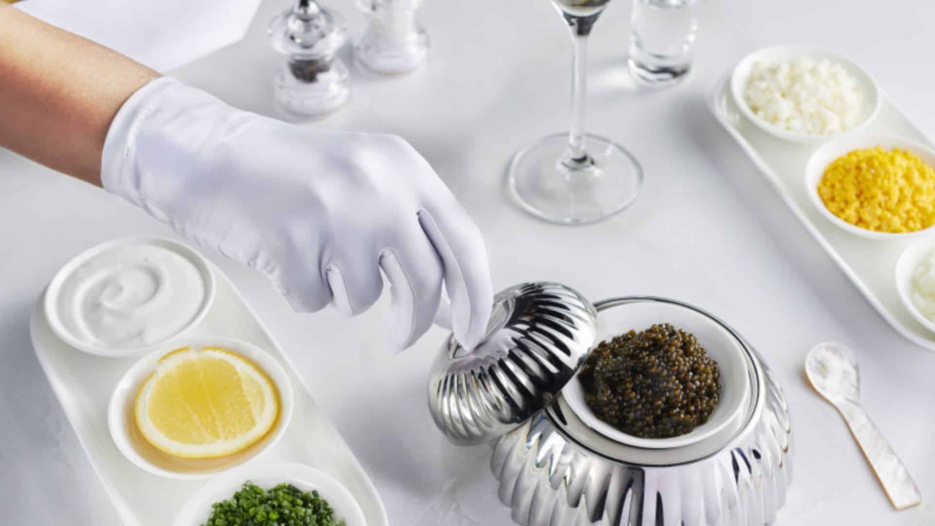 First Class Passagiere erhalten bei Emirates zu dem unbegrenzten Kaviar, in neuen eleganten und gravierten Schüsseln. Diese wurden von Robert Welch designt, die zu Emirates sonstigem Geschirr passen.