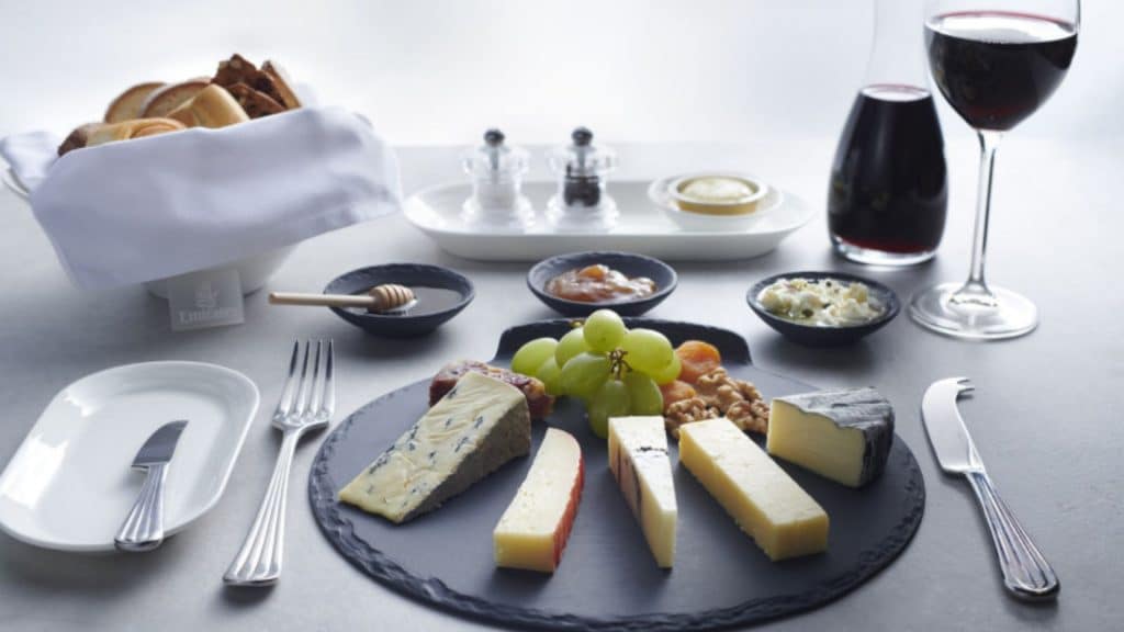 Die typische Käseplatte wird nun auf einer rustikalen Platte serviert, mit passenden Schüsseln und einem hölzernen Honiglöffel. Serviert wird eine Auswahl an Käse und Chutneys. Ein weiteres Detail ist zudem, dass die Kabinen Crew bei ihrem Service in der First Class ab sofort Handschuhe trägt.