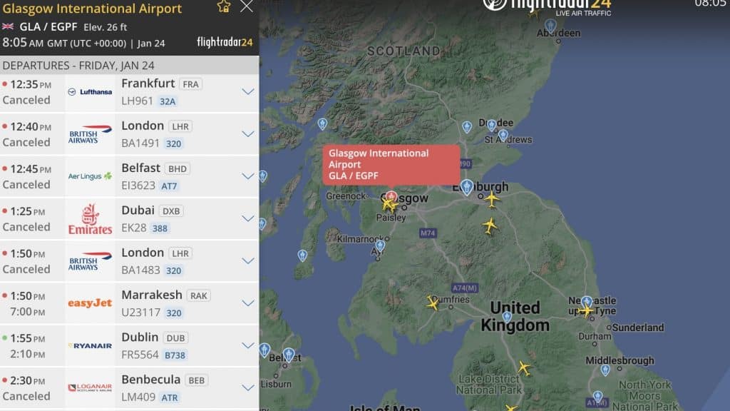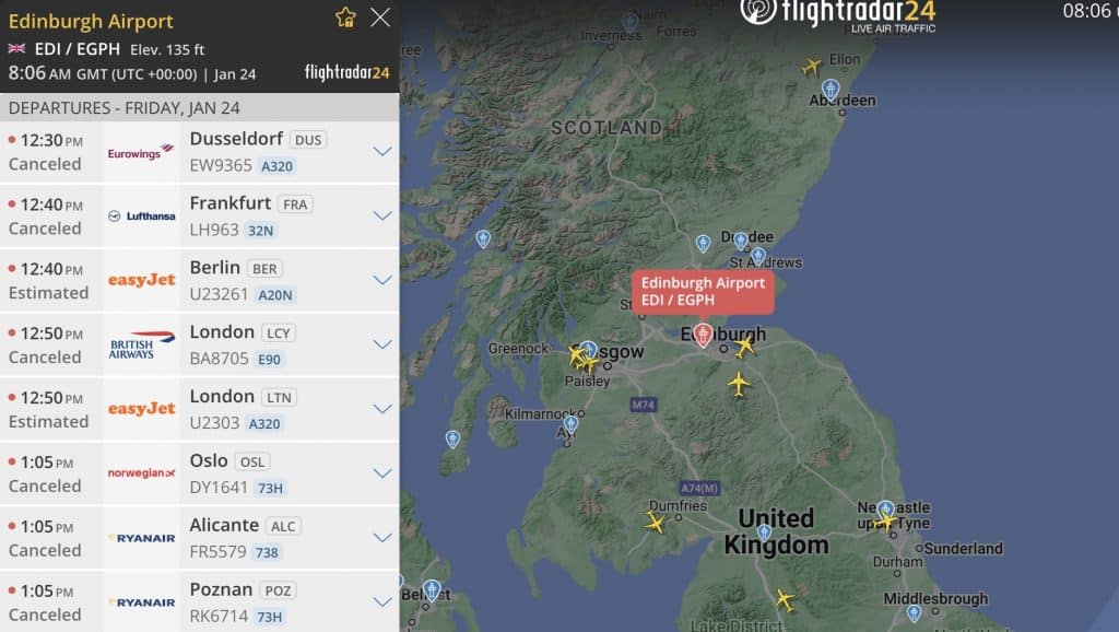 Nach einem kurzen Blick auf flightradar24 werden vor allem an den Flughäfen Dublin, Belfast, Glasgow und Edinburgh Flugstreichungen verzeichnet, aber auch in London kommt es zu vereinzelten Annullierungen.