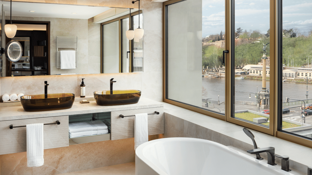 Gäste erwarten 320 Zimmer und Suiten sowie weitere 44 Unterkünfte mit der Fairmont Gold Experience. Stilvoll, ästhetisch, mit Blick auf die Moldau, den Innenhof oder den historischen Altstädter Ring präsentieren sich die komfortablen Räume. Neben goldverzierten Wänden sind die Bäder mit Doppelwaschbecken, Regendusche und Badewanne wahre Wellness-Oasen, die um Pflegeprodukte von Le Labo ergänzt werden.