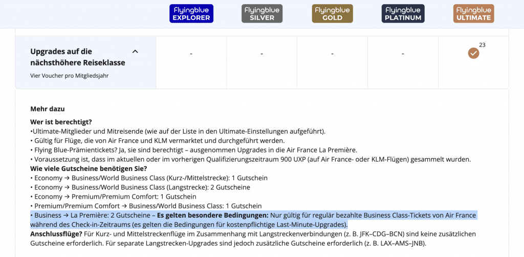 Beim Ultimate Status gibt es insgesamt vier Upgrade-Gutscheine für eine Kabine pro Mitgliedsjahr. Für ein Upgrade in die First Class sind zwei Voucher vonnöten. Allerdings ist dies erst innerhalb des Check-in-Zeitfensters und für bezahlte Business Class Tickets möglich. Zu dieser Zeit werden häufig auch bezahlte Upgrades ermöglicht. Für Upgrades auf die nächsthöhere Reiseklasse kommen generell nur Flüge infrage, die von Air France und KLM vermarktet und durchgeführt werden. Außerdem sind