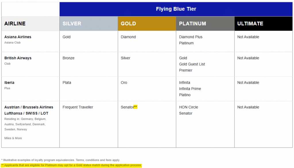 Flying Blue, das Loyalitätsprogramm von Air France und KLM, bietet noch immer Status Matches zu vergleichbaren Vielfliegerprogrammen an. Der Zugang ist jedoch geografisch eingeschränkt, an gestaffelte Gebühren gebunden und aktuell ausschließlich für Miles & More Mitglieder möglich. Bei erfolgreichem Status Match gilt der erhaltene Status für 12 Monate.