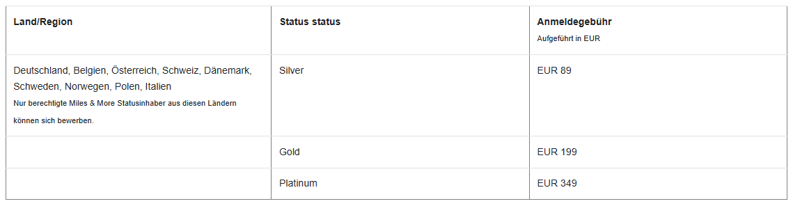 Sicher ist diese Möglichkeit für einige Miles & More Mitglieder ganz spannend. Nachfolgend die Übersicht für die ausgewählten Länder sowie die Gebühren für die jeweiligen Status:
