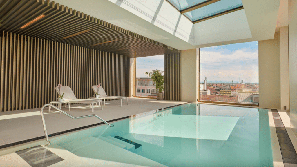 Der Private Spa mit Blick über München begeistert mit großzügigem Innenpool, Sauna und einer Erlebnisdusche. Um das kostenfreie zwei Stunden Fenster nutzen zu können, ist abhängig von der Verfügbarkeit, eine Vorabreservierung an der Hotelrezeption notwendig. In der separaten Spa-Lounge könnt Ihr Euch beispielsweise eine wohltuende Massage buchen oder eine Kleinigkeit zu Speisen und zu Trinken bestellen. Stilvoller kann man nur für sich in München wohl nicht ausspannen.