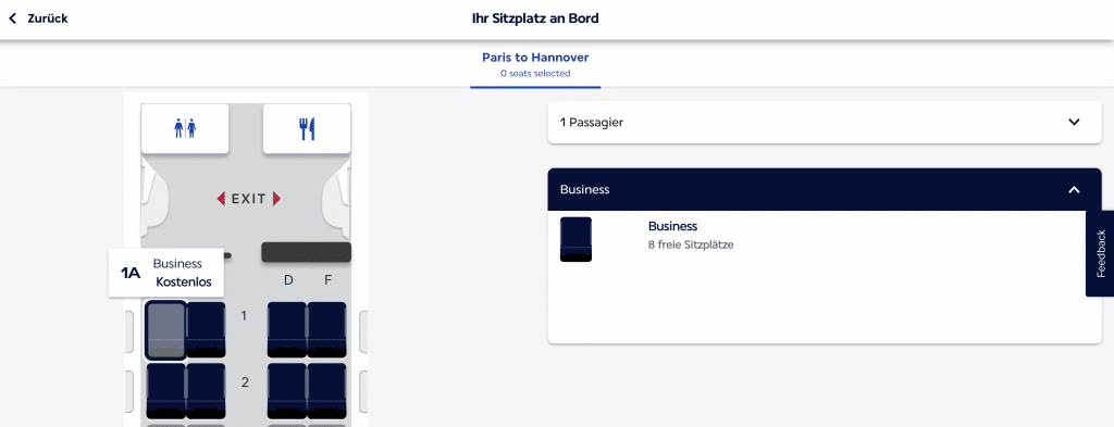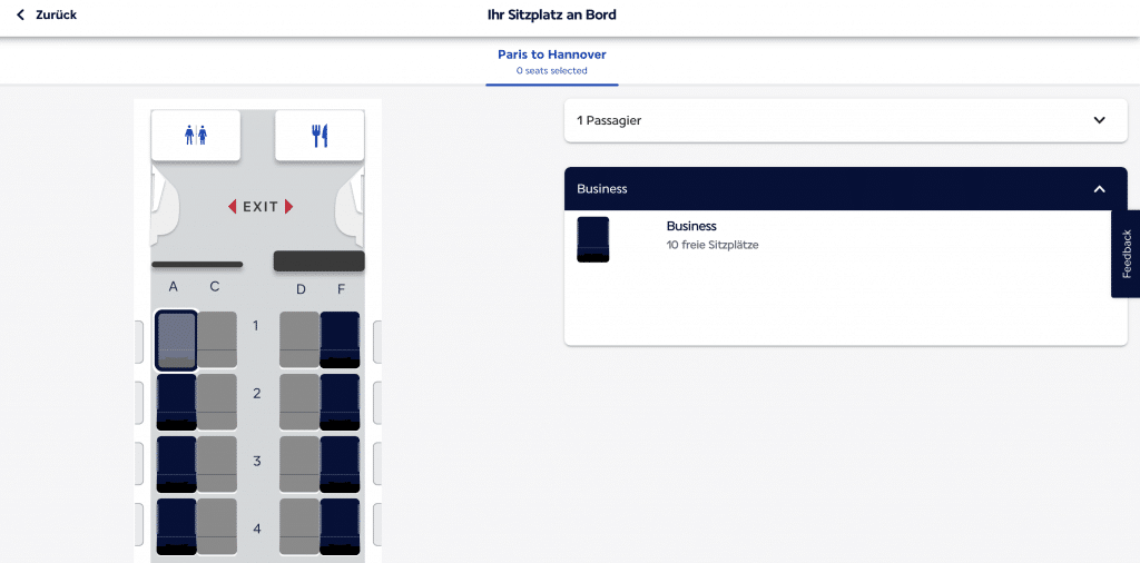 Schauen wir uns die Sitzplatzreservierung für ein Ticket in der Business Class im Air France HOP! Embraer 170, der auf der Strecke von Paris nach Hannover eingesetzt wird, sind alle Sitzplätze (nach Verfügbarkeit) buchbar: