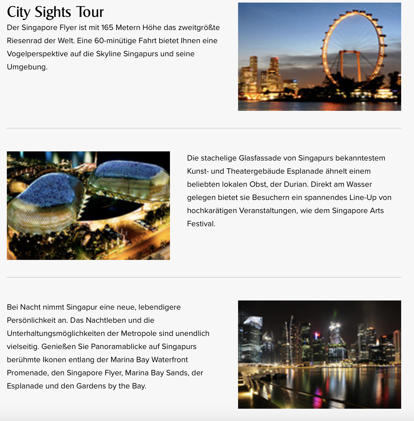Bei den Touren handelt es sich um zwei verschiedene Bus Touren, die gemeinsam von Airline, Flughafen und dem Tourism Board veranstaltet werden. Zur Auswahl stehen dabei zum einen die Heritage Tour, die Euch durch die Geschichte und die heutige Vielfalt Singapurs führt. Die alternative City Sights Tour (hierfür müsst Ihr mindestens 6 Stunden Aufenthalt in Singapur haben) führt Euch zu den bekanntesten Sehenswürdigkeiten der Stadt.