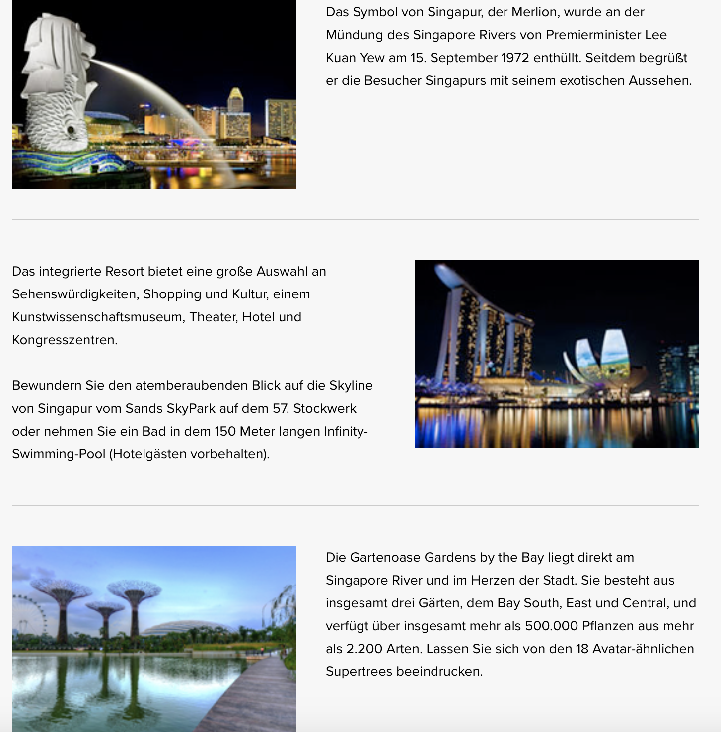 Mit seinen vielfältigen Angeboten macht Singapore Airlines dem Ruf als beste Airline der Welt einmal wieder alle Ehre. Für jede Aufenthaltsdauer gibt es eine attraktive Möglichkeit zur Zeitüberbrückung. Insbesondere für alle, die einen längeren Aufenthalt haben, kann sich eine Tour in die Stadt lohnen. So könnt Ihr beispielsweise auf einem Flug nach Australien oder Neuseeland noch ein weiteres spannendes Ziel kennenlernen und müsst dafür nicht einmal etwas extra bezahlen. Aber auch, wer einen längeren Zwischenstopp hat oder ihn absichtlich einbaut, um seine Reise zu entzerren oder sich Singapur anzusehen, kann auf ein wirklich attraktives Stopover Angebot zurückgreifen!