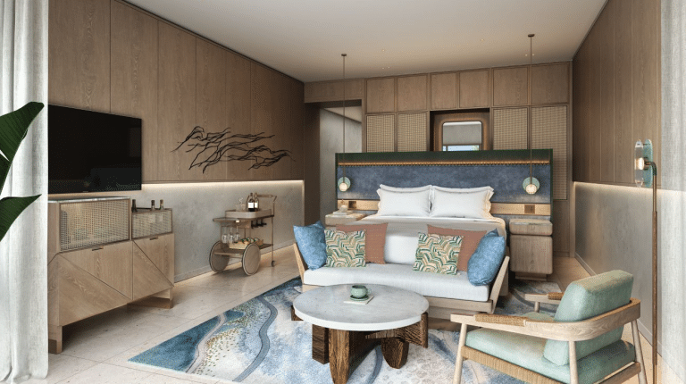 Das üppige Grün der Palmen und die von dramatischen Klippen geprägte Küstenlandschaft bildeten die inspirierende Kulisse für das architektonische Konzept des Hotels. Hier verschmelzen Natur und Lebensart zu einer harmonischen Kunstform, die sich in sanft geschwungenen Linien und einer warmen, erdigen Farbpalette widerspiegelt. Die 200 Gästezimmer und Suiten zelebrieren karibische Lebensfreude mit maßgefertigten Möbelstücken und feinen Details, die an die lebendige Küstenlandschaft erinnern. Alle Räume eröffnen einen atemberaubenden Ausblick, während die 36 großzügigen Suiten – mit Flächen von bis zu 600 Quadratmetern – durch private Tauchbecken vollendete Exklusivität bieten.