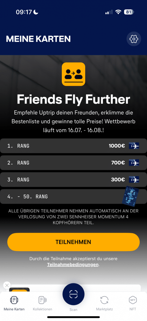 Daneben gibt es in der Uptrip-App aber aktuell noch eine Challenge, die Mitte August endet. Wer bis dahin die meisten Freunde wirbt, erhält als Prämie einen Lufthansa Gutschein im Wert von 1.000 Euro. Für den Zweitplatzierten gibt es noch 700 Euro und für den Drittplatzierten 300 Euro. Wer auf den Plätzen 4 bis 50 landet, erhält eine Joker Card (sofern man noch keine besitzt). Alle anderen Teilnehmer nehmen automatisch an einer Verlosung von zwei Sennheiser Momentum 4 Kopfhörern in der Luftahnsa Edition teil.