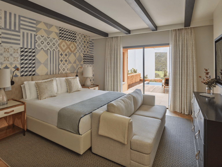 Das weiße Gebäude des Viceroy at Ombria Algarve erinnert in seiner Architektur an die verwunschene Eleganz traditioneller Fischerdörfer und erhebt sich majestätisch über die sanften Hügel der Algarve. Das Resort, welches durch seine Höhe einen atemberaubenden Ausblick bietet, verfügt über 141 Zimmer, welche in Standard Gästezimmer, luxuriöse Suiten und exklusive Residenzen unterteilt sind. Die schlichten Farben der Zimmer werden von raffinierten Formmustern untermalt und erwecken so die Räume zum Leben. Die bis zu 980 Quadratmeter großen Gästezimmer empfangen Euch mit einem schattigen Balkon, einer idyllischen Terrasse oder einem privaten Tauchbecken, das wohltuende Erfrischung an warmen Tagen verspricht.