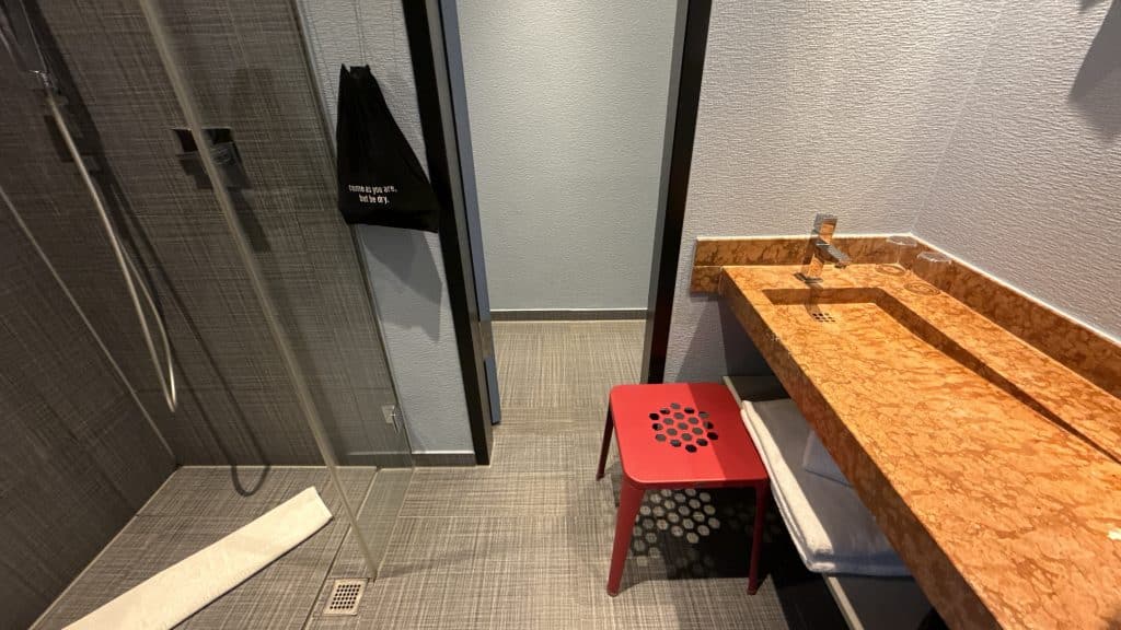 Das Bad ist insgesamt also ebenfalls recht minimalistisch gehalten. Bei meinem letzten Aufentahlt war das Bad ebenfalls “besonders” gestaltet, wenngleich zumindest die Dusche hier etwas besser vom Rest des Badezimmers abgetrennt war.