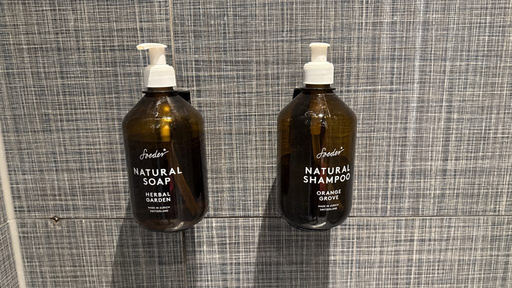 Immerhin stehen eine Regendusche sowie eine Handbrause zur Verfügung. Positiv aufgefallen sind dabei die Pflegeprodukte der Schweizer Premiummarke Soeder, allerdings gibt es keinen Conditioner.