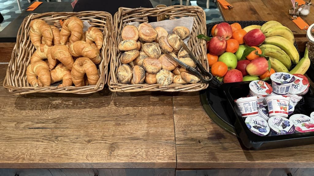 Frischen Saft gibt es dagegen leider nicht, hier kann man sich am Buffet bedienen. Dasselbe gilt für Backwaren, Joghurt und Obst.