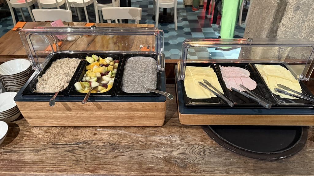 Ansonsten findet man am Buffet auch noch ein wenig Müsli und einige andere Kleinigkeiten. Ein bisschen Käse, Wurst sowie Bircher Müsli und Obstsalat. Insgesamt also nicht gerade ein allzu umfangreiches Buffet, das aber in Verbindung mit dem à la carte Angebot durchaus in Ordnung ist.
