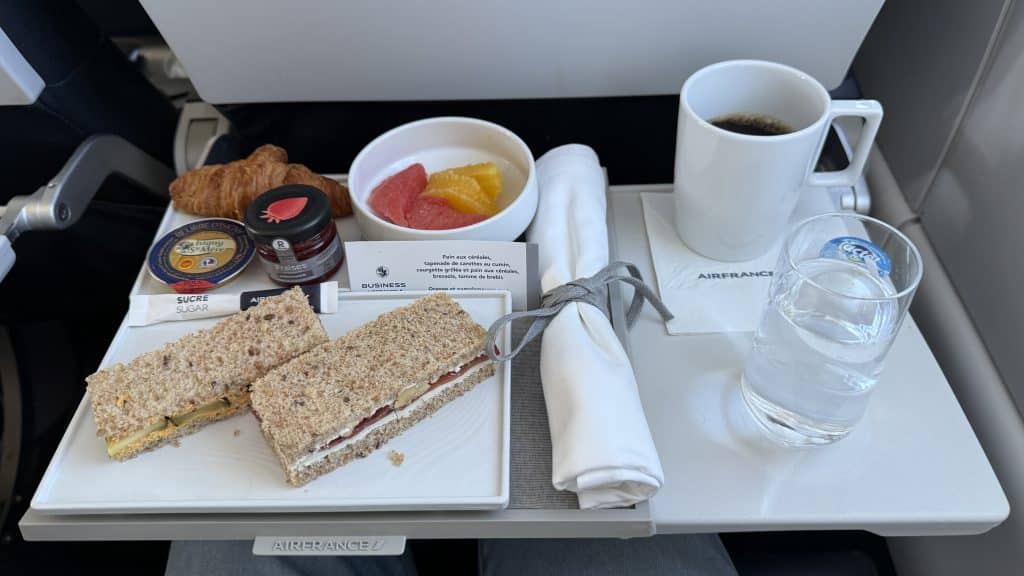 Nicht nur die Größe der Portionen, sondern insbesondere die Qualität und der Geschmack konnten mich in meiner Air France Business-Class Kurz- und Mittelstrecke Bewertung dabei überzeugen, sodass das Catering sicherlich ein Argument ist, das für die Business Class von Air France spricht. Eine Flasche Wasser findet man übrigens generell schon am Platz, sobald man an Bord geht, was auch noch einmal eine nette Geste ist. Ein wenig kritischer war ich auf meinem Flug in jüngster Vergangenheit, denn zum einen war die Portion zum Frühstück deutlich kleiner als der Vergangenheit, zum anderen war das Sandwich noch teilweise gefroren.