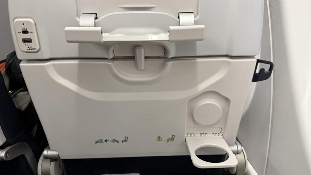 Positiv aufgefallen ist mir an den Sitzen allen voran, dass diese nicht nur Ablagefläche in Form von einer Tasche sowie einem Staufach für Zeitschriften bieten, sondern auch eine USB A sowie USB C-Ladebüchse, einen ausklappbaren Tisch, einen Becherhalter sowie zusätzlich auch noch einen Tabletthalter.