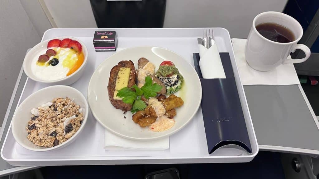 Vor dem Abflug wird ein Wasser gereicht. Dies ist allerdings eher der geringste Standard, den man auch auf einem regionalen Flug erwarten darf. Nach Abflug kam für mich dann persönlich aber eine etwas größere Überraschung. Auf dem knapp zweistündigen Flug wurde ein volles Catering mit warmen Speisen gereicht. Dies kann man sicher noch mitunter erwarten, aber dass die Auswahl dann noch darin bestand, zwischen einem Frühstücksgericht und einer vegetarischen Alternative auszuwählen, hat mich dann doch sehr positiv überrascht. Leider gilt ja gerade auf der Kurzstrecke in Europa doch häufig das Motto “Friss oder stirb” bei dem geladenen Catering.