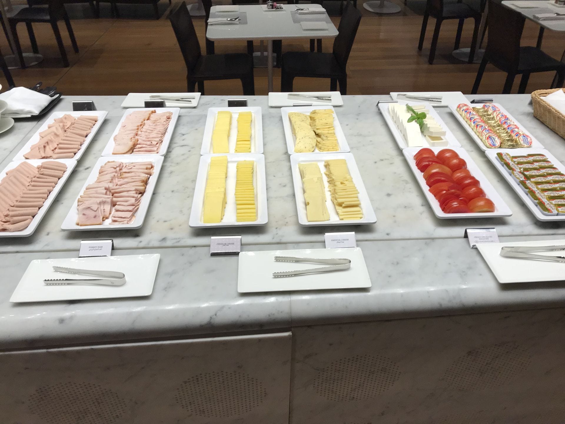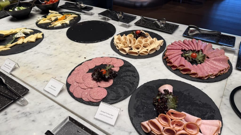 Moritz konnte sich bei seinem Test der Al Mourjan Business Class Lounge Doha am Frühstücksbuffet bedienen, das ihm insbesondere mit Blick auf die kalten Optionen positiv aufgefallen ist.