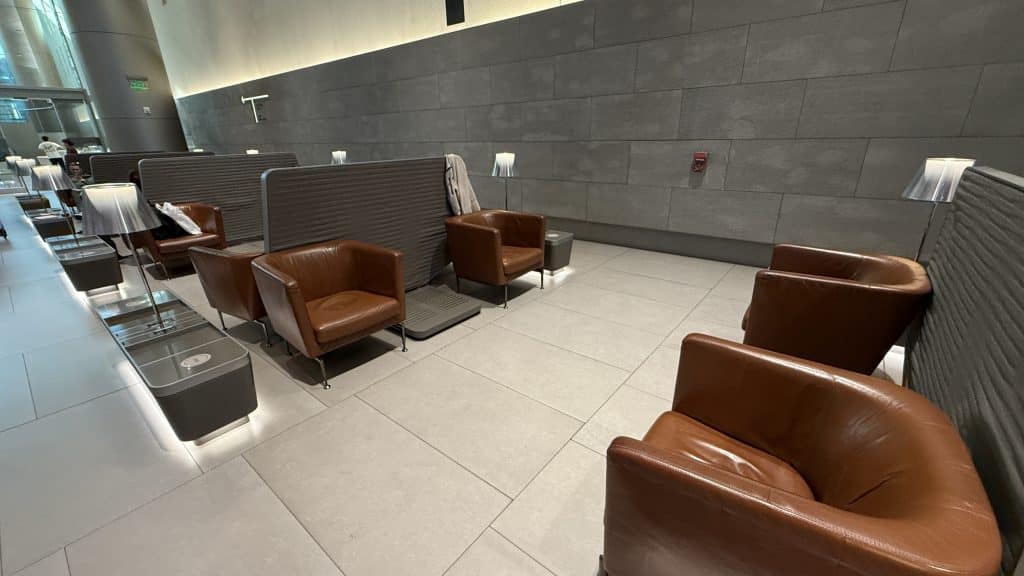 Hier gibt es einzelne, voneinander abgetrennte Kabinen, in denen eine sehr bequeme Couch sowie ein Ledersessel mit Fußablage bereitstehen. Diese eignen sich perfekt zum Schlafen. In den Kabinen ist ansonsten noch ein Fernseher zu finden, der über die Abflugzeiten informiert. Sehr angenehm waren diese Schlafkabinen, da diese erst nach Anmeldung an einer “Rezeption” betreten werden können.