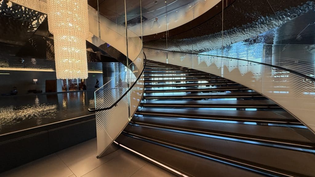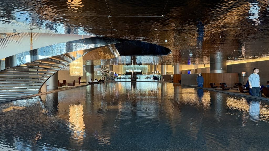 Nachdem man die Lounge betreten hat, steht man vor einer großen Fläche mit diversen Sitzmöglichkeiten und einem Wasserspiel sowie einer großen, offenen Wendeltreppe, die zu einem der Restaurants im oberen Bereich der Lounge führt.