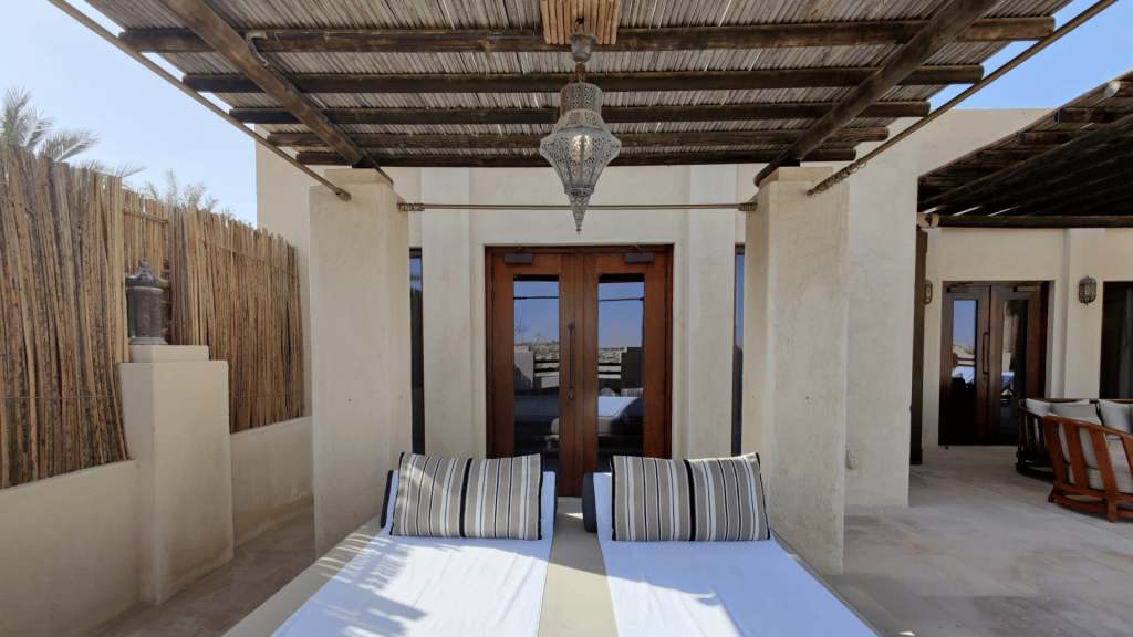 Auf geschätzt mehr als 60 Quadratmetern findet man wirklich jede Sitzgelegenheit, von der man träumen kann. Direkt vor dem Schlafzimmer gibt es etwa eine Doppelliege mit Gazebo, von der man den Blick auf die Wüste genießen kann. Einige Kissen liegen auch schon bereit, genauso waren bei meiner Ankunft Handtücher ausgelegt.