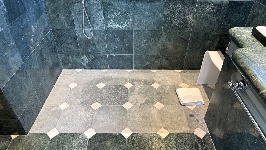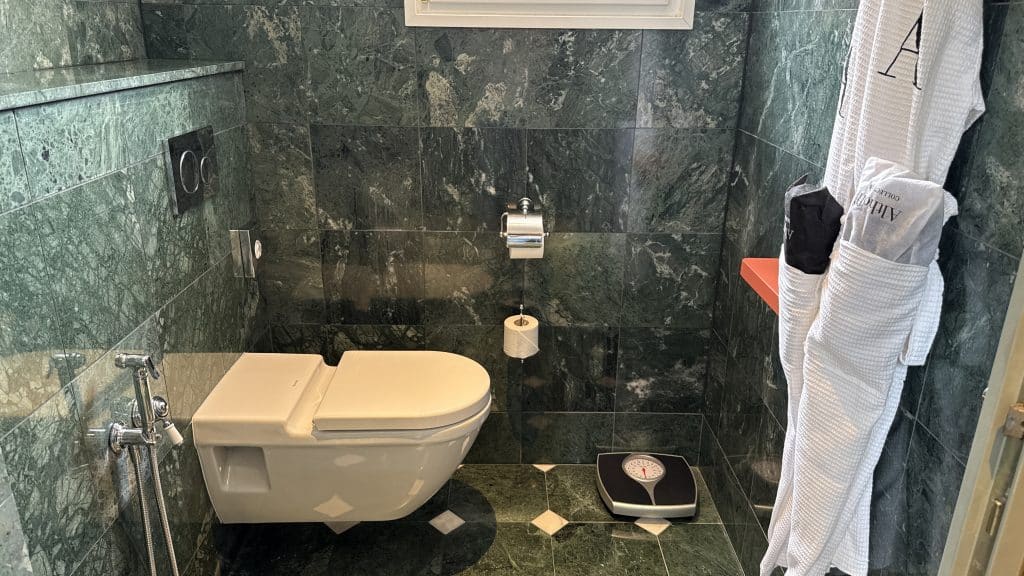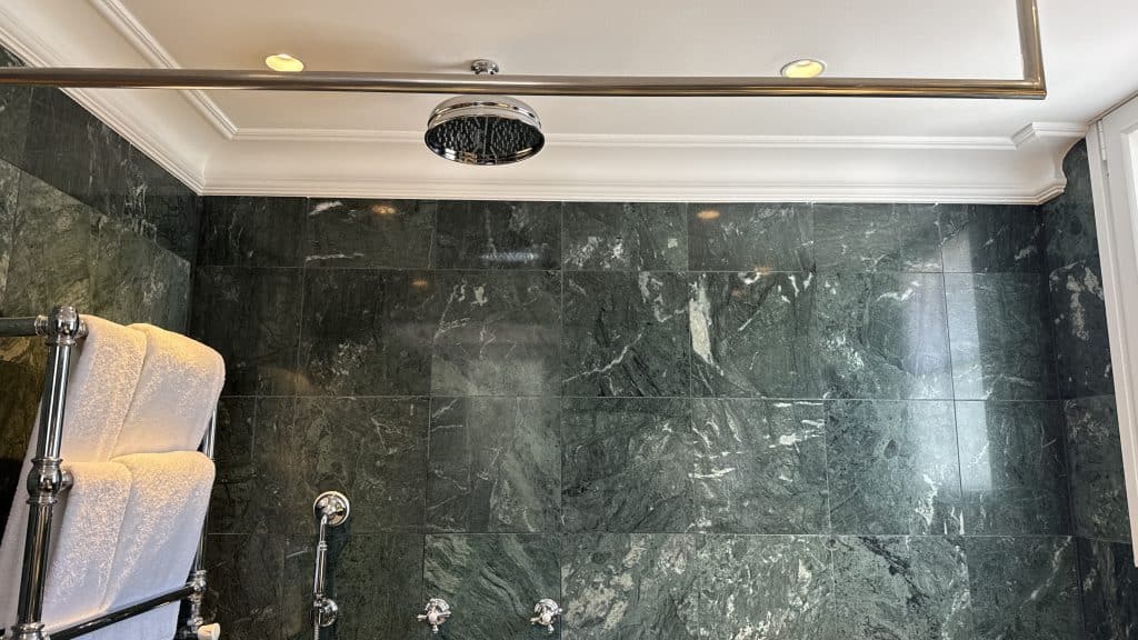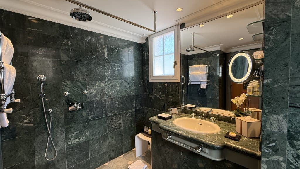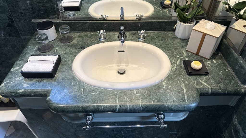 Zuletzt möchte ich bei der Betrachtung des Zimmers auch noch einen Blick ins Badezimmer werfen, das ebenfalls renoviert wurde. Dieses weist allerdings noch den alten grünen Marmor auf, den ich etwa auch von meiner Althoff Seehotel Überfahrt Bewertung kenne.