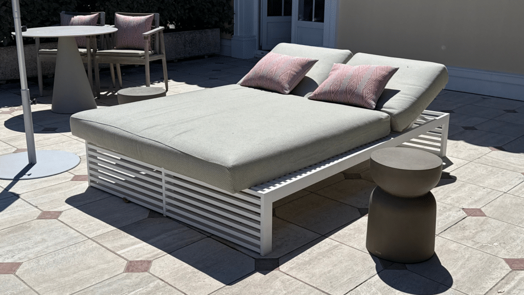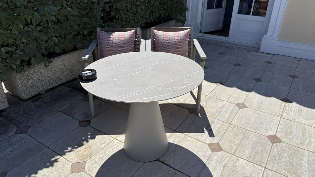 Auf der Terrasse findet dabei zum einen ein Tisch mit zwei Stühlen Platz. Hier kann man etwa toll ein Room Service Frühstück zu sich nehmen, das ebenfalls inkludiert ist und nur einen Etagenaufschlag kostet.